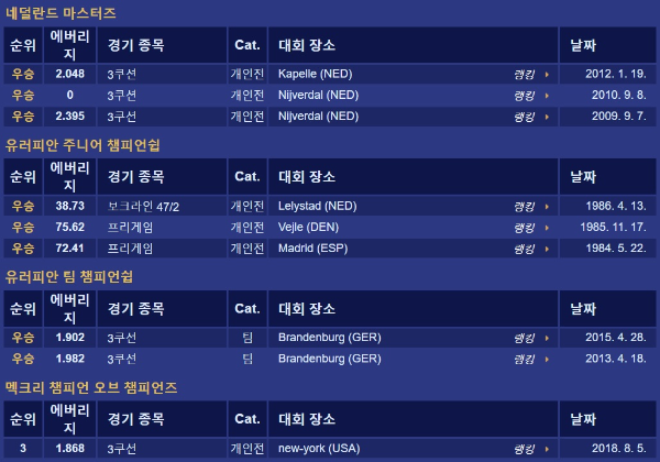 *순위/에버리지/경기 종목 /Cat. /대회 장소(국가) /날짜 순입니다.