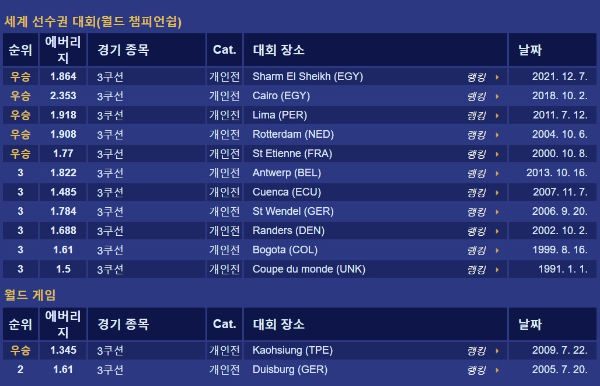 *순위/에버리지/경기 종목 /Cat. /대회 장소(국가) /날짜 순입니다.