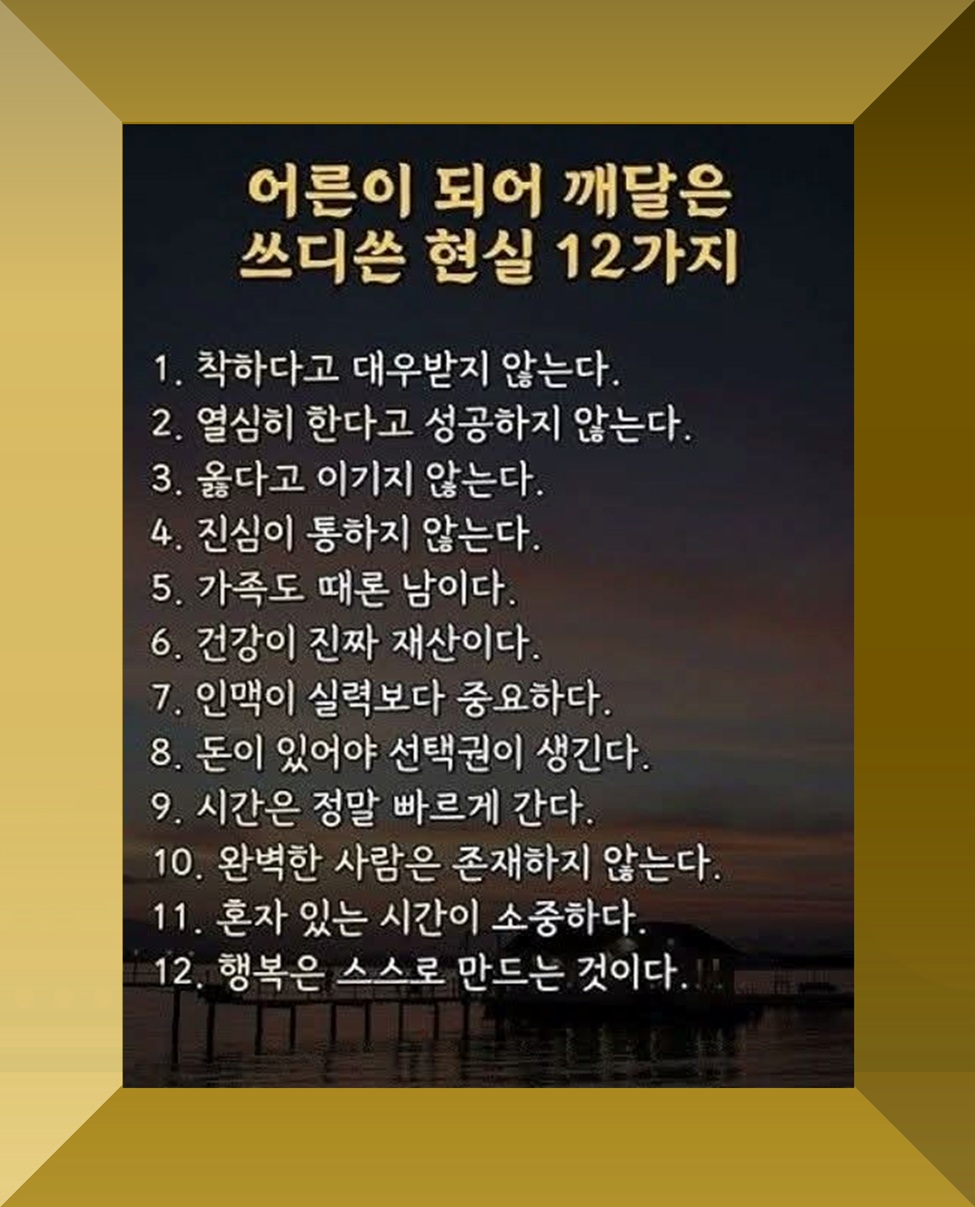 위의 12가지 메세지의 원본 메세지 출처는 불분명하지만, 마치 삶의 지혜, 인생 격언처럼 시간이 흐르며 저절로 알게 되는 삶의 진실들입니다. 때로는 아프고, 때로는 위로가 된다. 중요한 건 이 현실을 부정하지 않고 받아들이면서도 그 안에서 나만의 행복을 만들어 가는 일이겠지요. 오늘도 여러분의 하루가 의미 있고 따뜻하길 바랍니다.